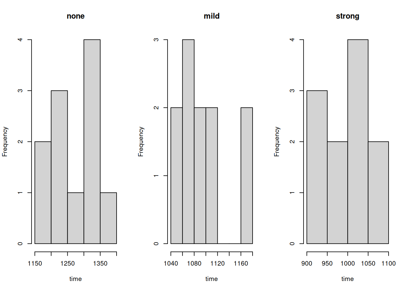 hist(results[results$group == group, "time"], main = group, xlab = "time")